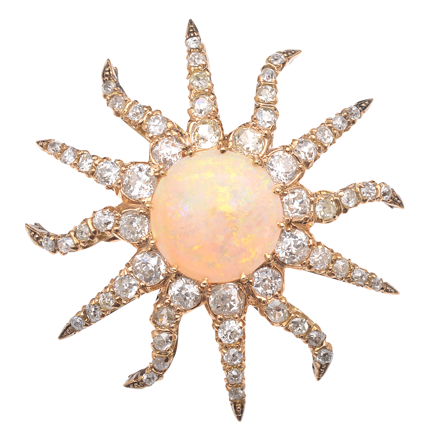 Of starfish design, centrally set with an opal cut en cabochon, each free form arm set with a row of graduated old European cut diamonds totallng 6.30cts, signed Forster, mounted in 18ct gold.