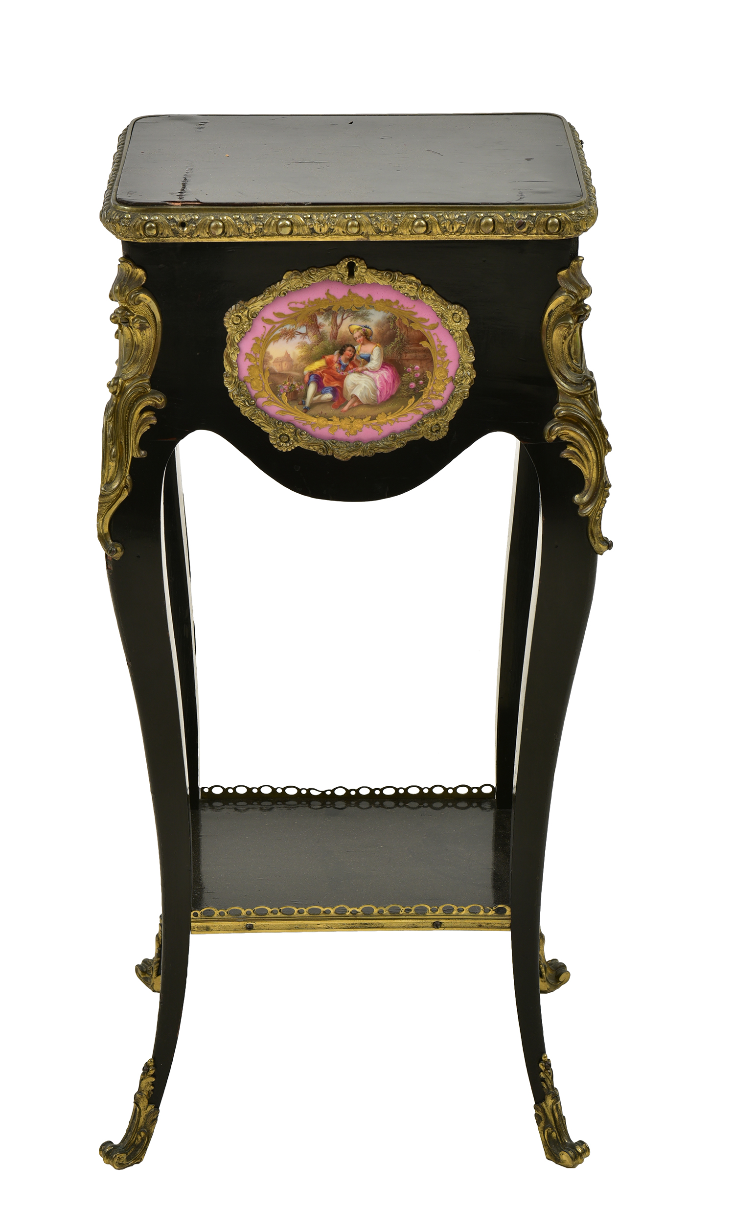 the ebonised two tier pedestal with brass mounts and inset with a circular porcelain plaque depicting a courting scene