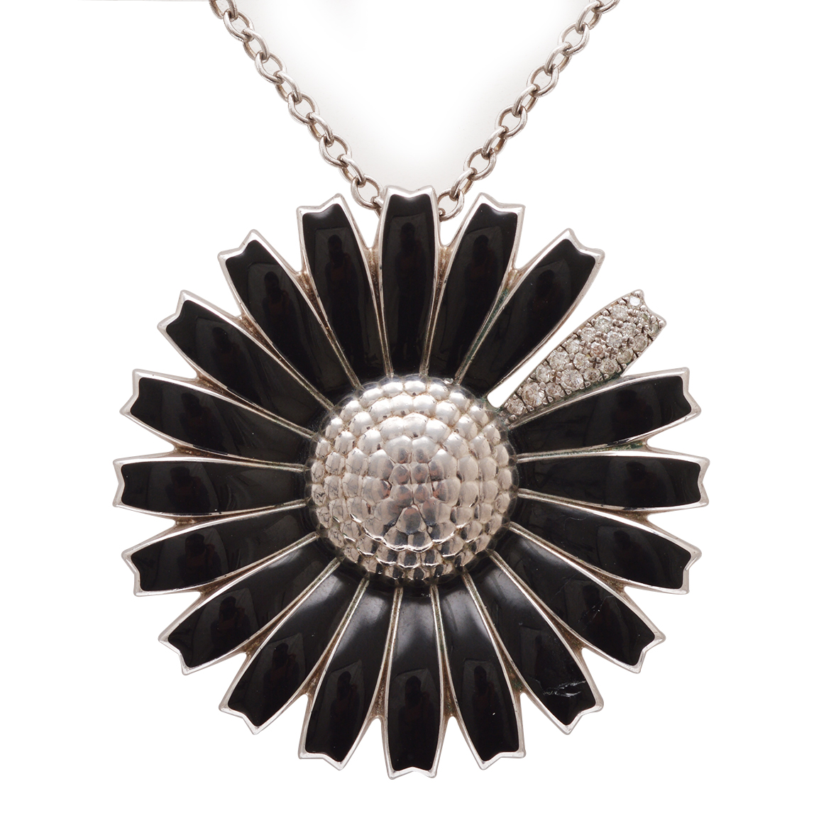 The curved circular design with black enamel petals and one pave set diamond set, suspended from a long signed chain, all in sterling silver.