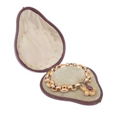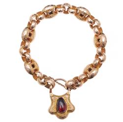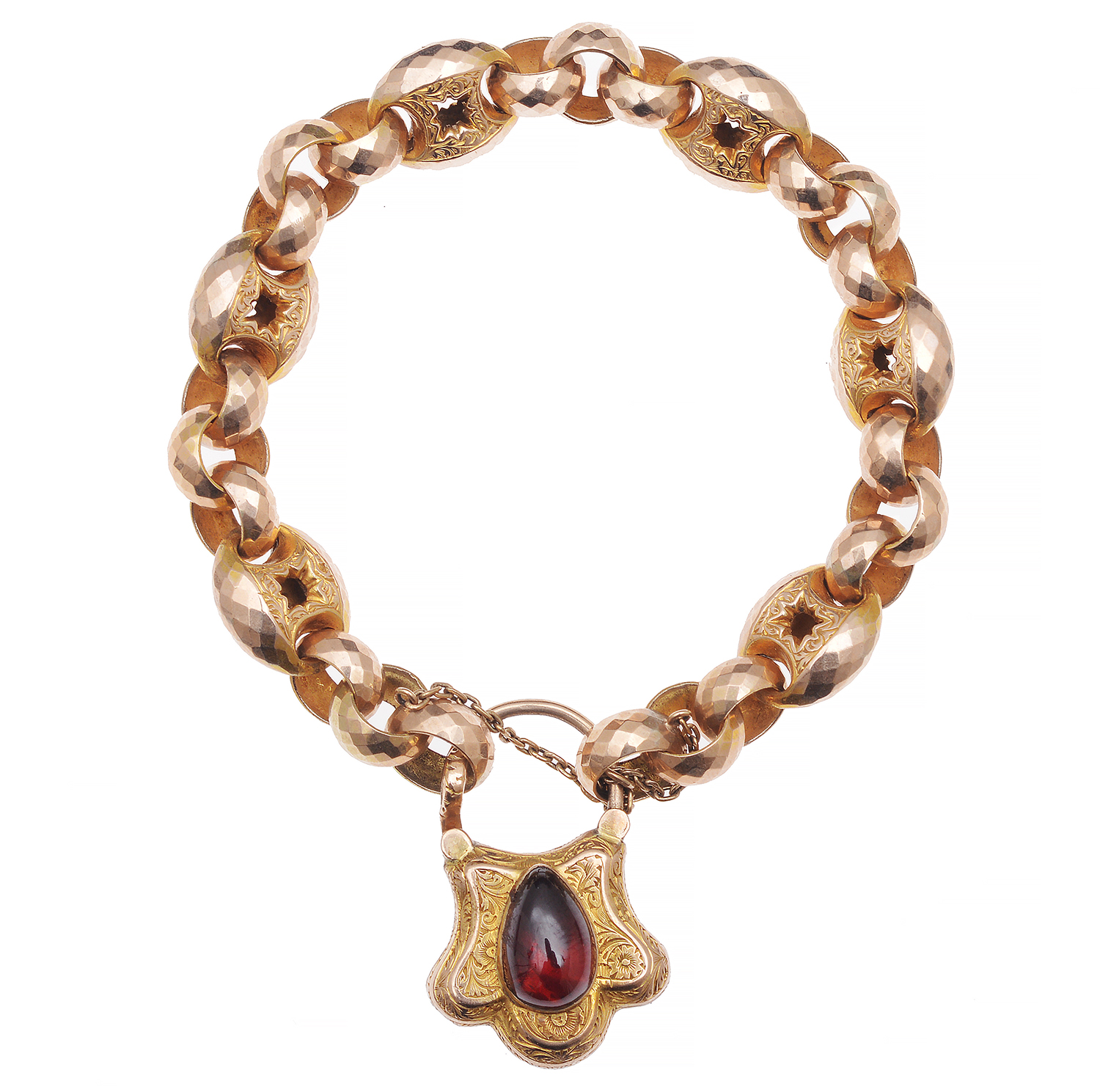 The fancy belcher link bracelet with bright cut and engraved decoration finished with an elaborate engraved padlock set with a pear cut garnet cut en cabochon, having a glazed section to the reverse, all in rose gold, total length 190mm, presented in original fitted box.
