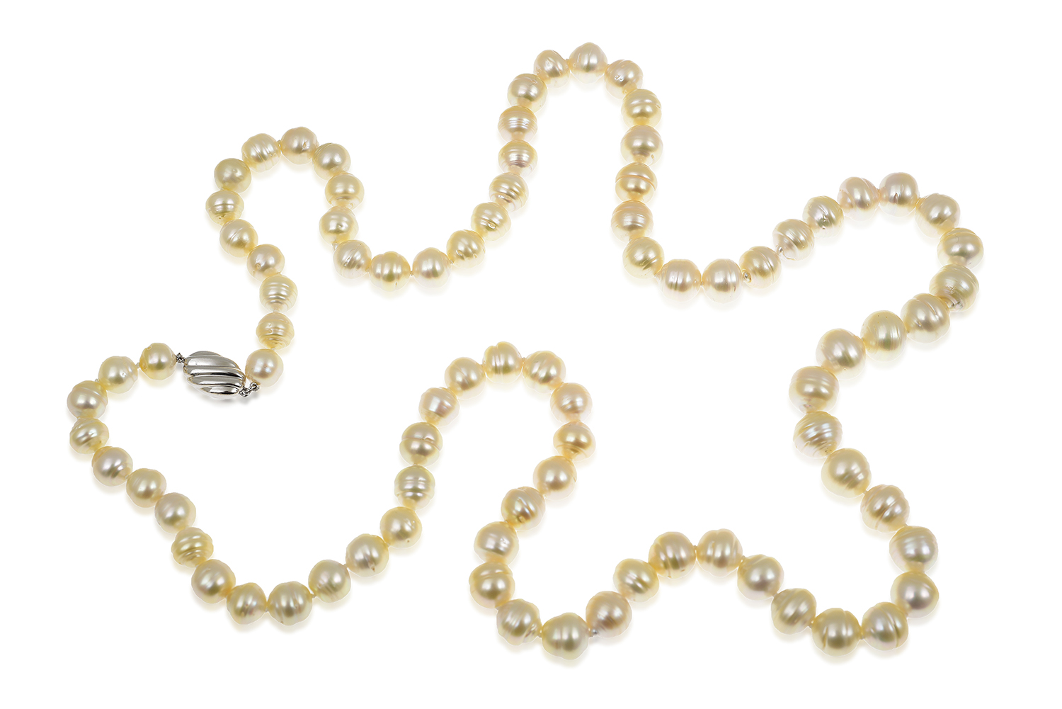 Comprising eighty four baroque pearls of cream and white hues measuring 9.05mm to12.7mm, to a sterling silver clasp, total length 890mm.