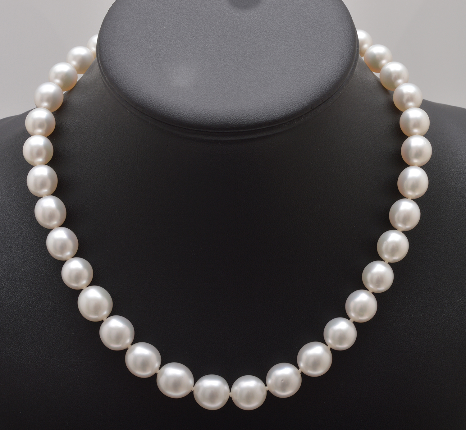 Comprising thirty seven near round pearls of cream and white hues measuring 10.00mm - 12.00mm, to an 18ct white gold clasp, total length 440mm.
