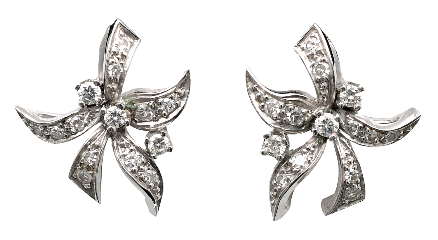 Each floral cluster earring set with round brilliant and single cut diamonds, mounted in 18ct white gold, retailed by Hardy Brothers, boxed.