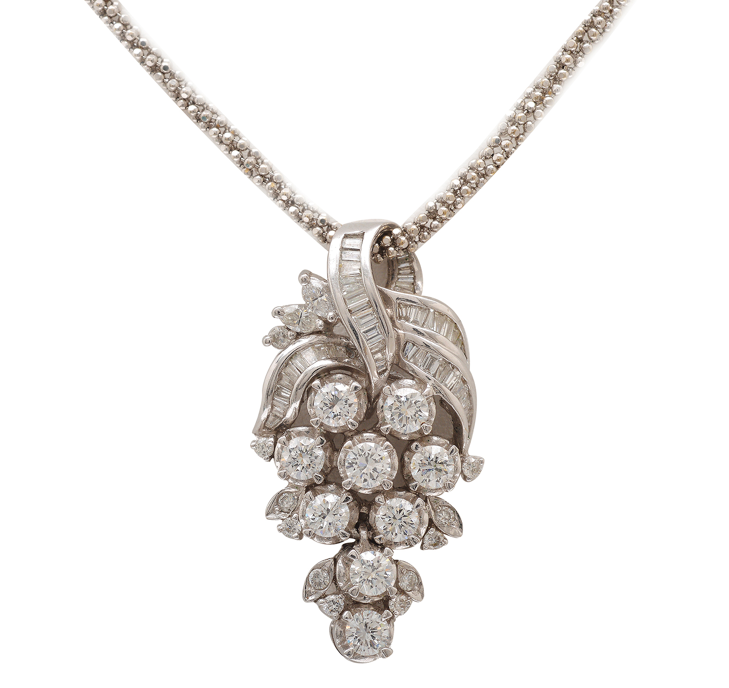 The floral cluster set with baguette, marquise and round brilliant cut diamonds totalling 2.70cts, suspended from a fancy link chain, all in 18ct white gold, total length 405mm.