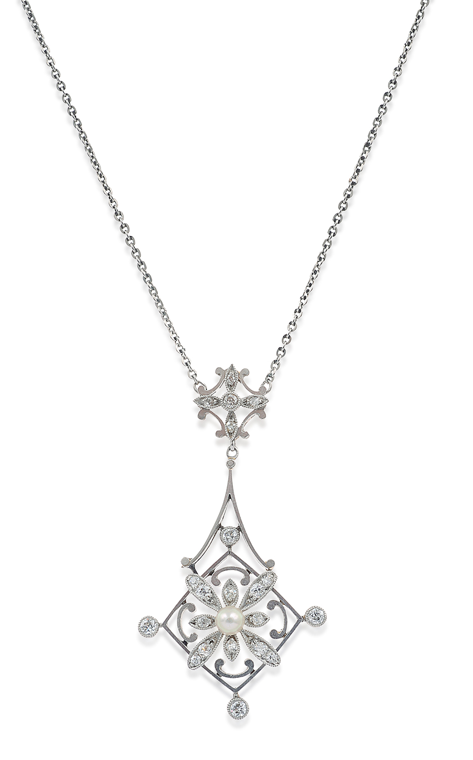 Of pierced floral design comprising two graduated panels set throughout with early round brilliant cut diamonds and finished with a natural pearl, to a fine trace chain, all set in platinum, total length 425mm.