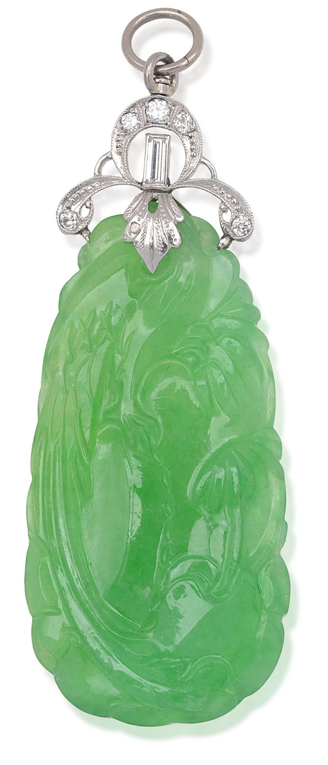 The carved jadeite panel of translucent green depicting a phoenix, weighing 62.0cts, surmounted by a diamond set bale with engraved and chased decoration, mounted in platinum.