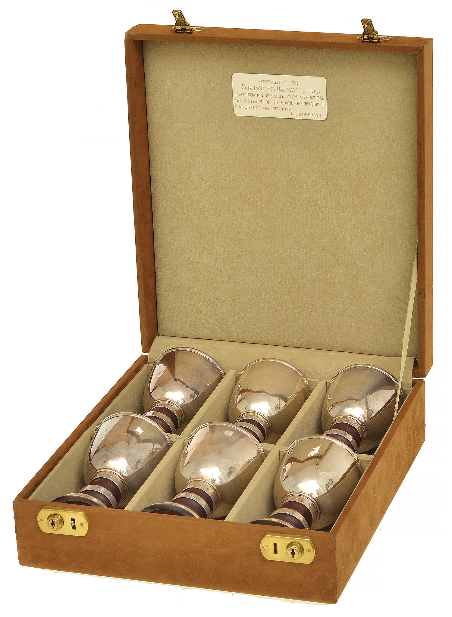 Provenance : the goblets were presented to Sir Roger Darvall in appreciation of fifteen years as chairman and member of the board of directors of L. M. Ericsson Pty Ltd, presented October 11, 1982
