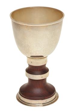 the hand raised silver applied over turned and polished red gum timber stem, hallmarked 925 along with the markers initials, each goblet 14cm high