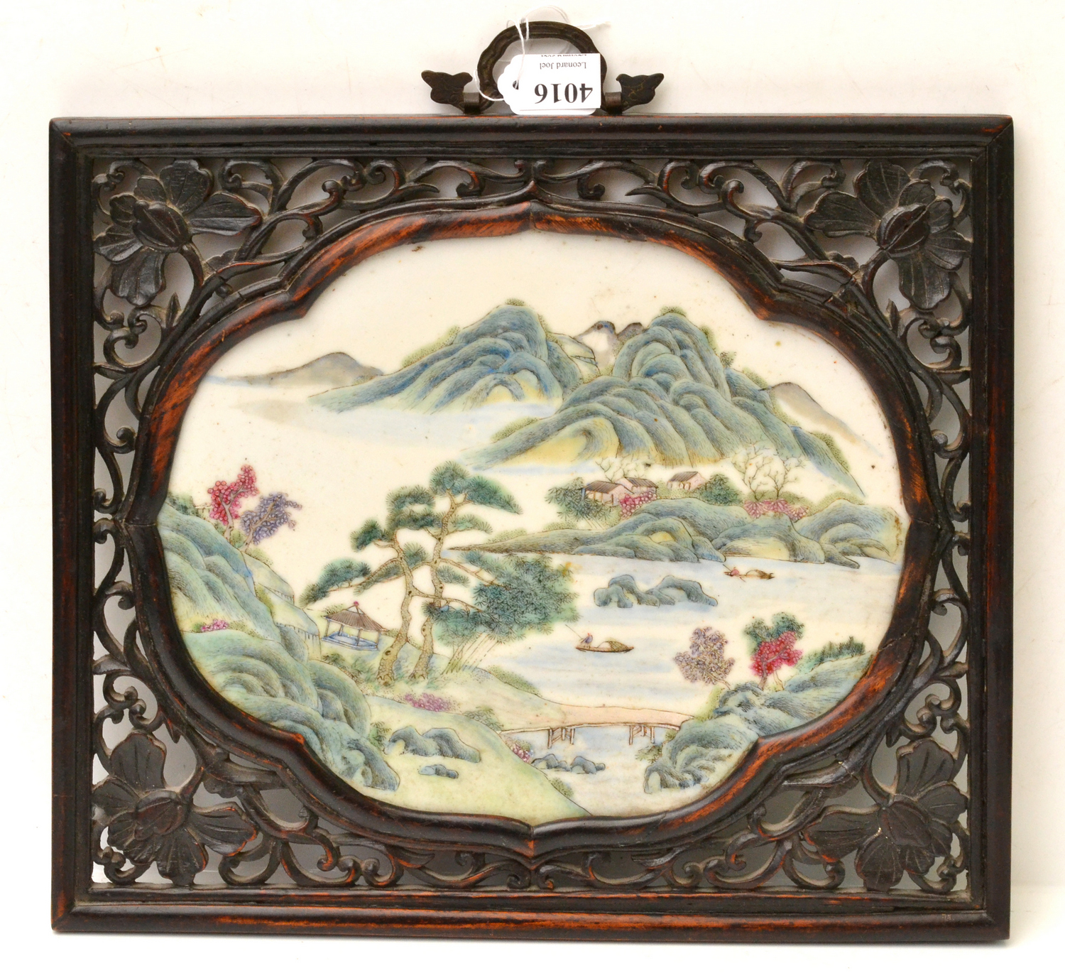 the pierced wooden frame inset with an quatrfoil shaped enamelled famille rose plaque depciting a serene mountainous valley, 26.5 x 29.5cm
