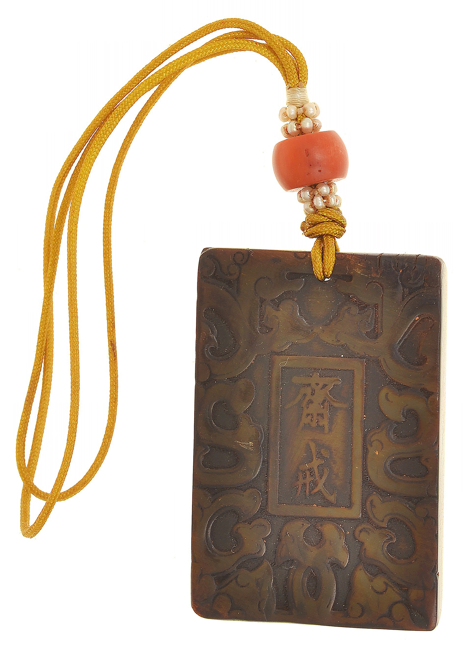 rectangular, with two stylised confronting qilin, their bodies framing a rectangular cartouche at the centre with two characters, the plaque attached to a mustard loop adorned with a single coral bead and two rows of seed pearls, 5.5 x 4 x 1cm