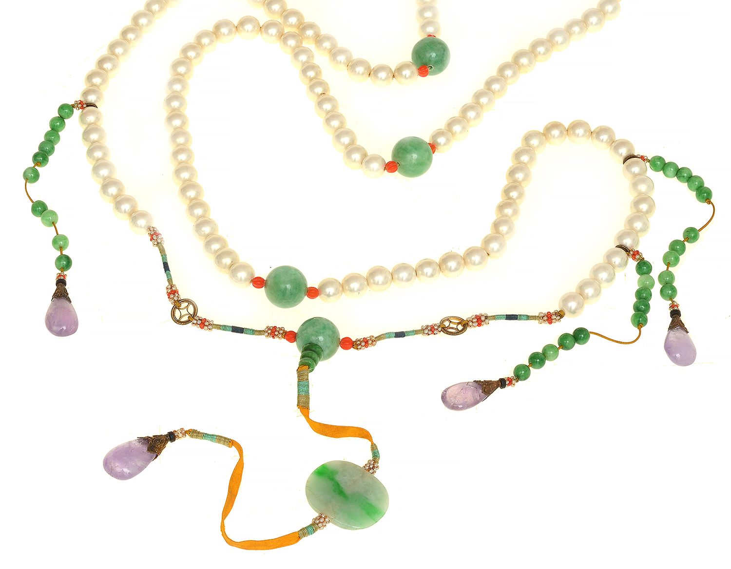comprising of alternating beads inclduing faux perals, jadeite and amythest, total lenght 109cm
