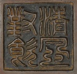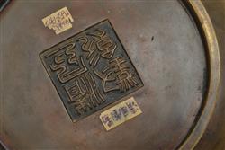 the compressed circular bowl, tri-footed, featuring raised twin handles, Kangxi seal mark to base, not of the period, 8cm high