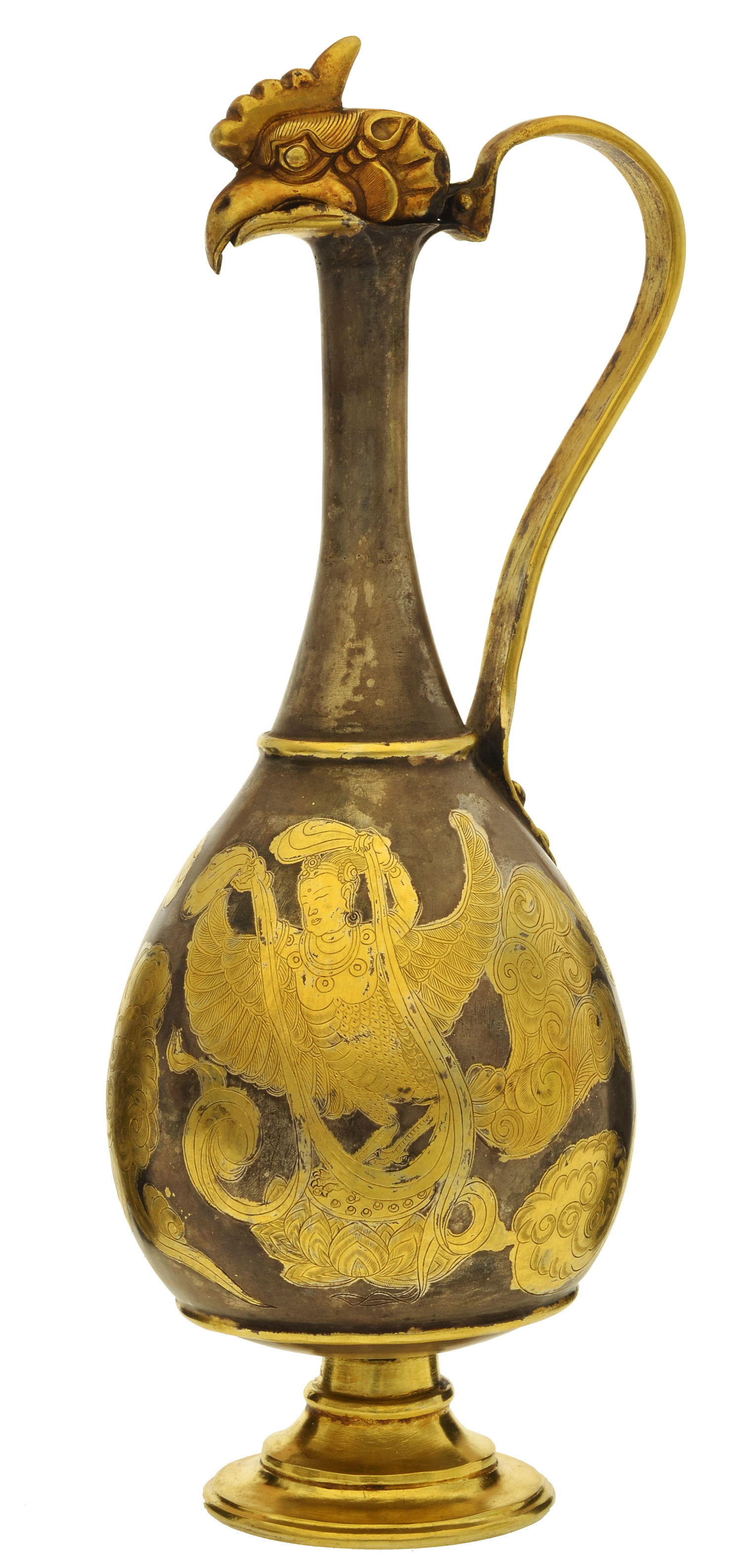baluster, the body decorated in gold with a mythological scene below an exaggerated neck and handle rising to an zoomorphic spout in the shape of a chicken, approximately 502 gms, 25 cm high