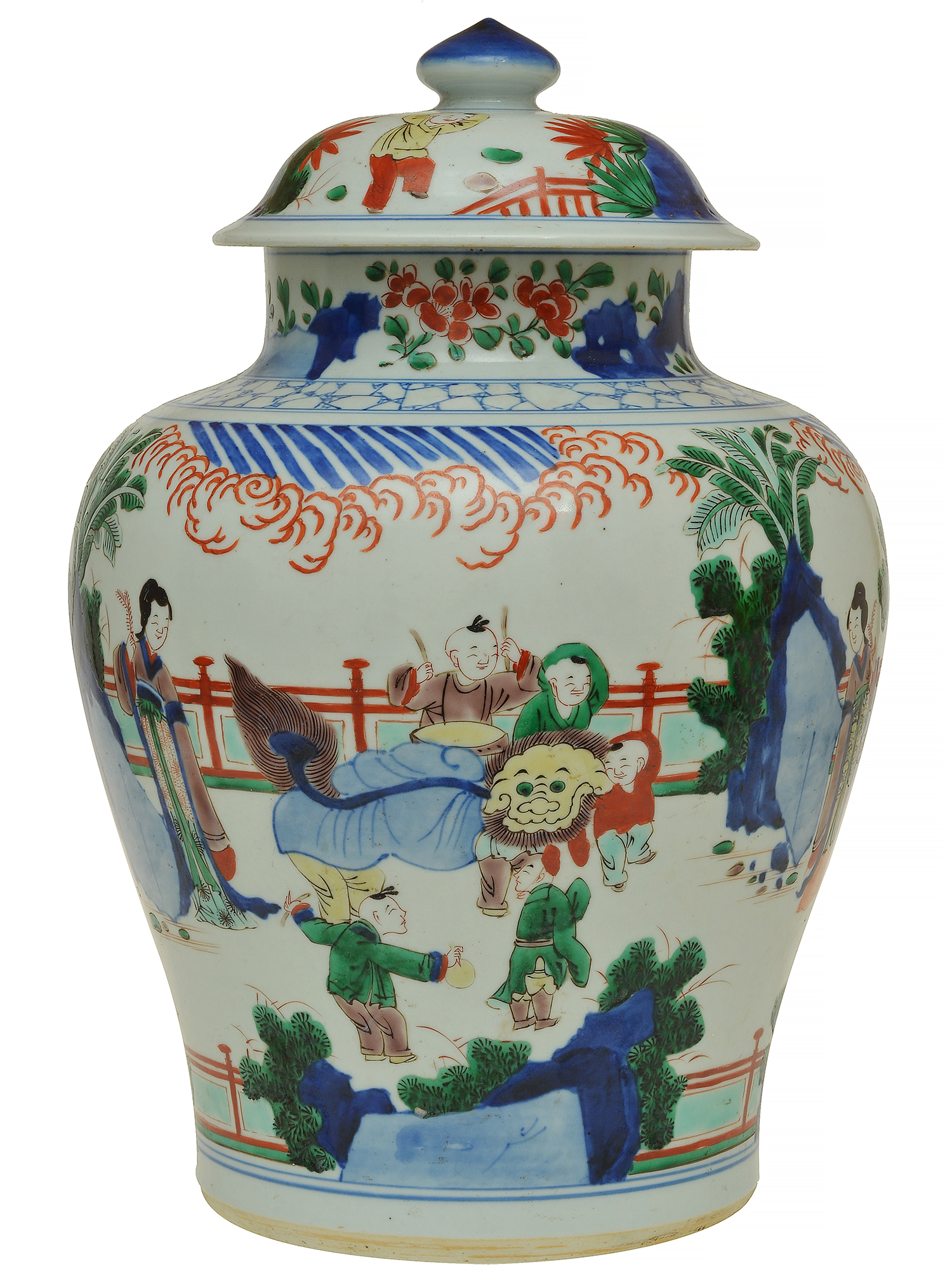 baluster in form, with an enamelled karako children scene to jar and lid, the jar and cover 39 cm high
