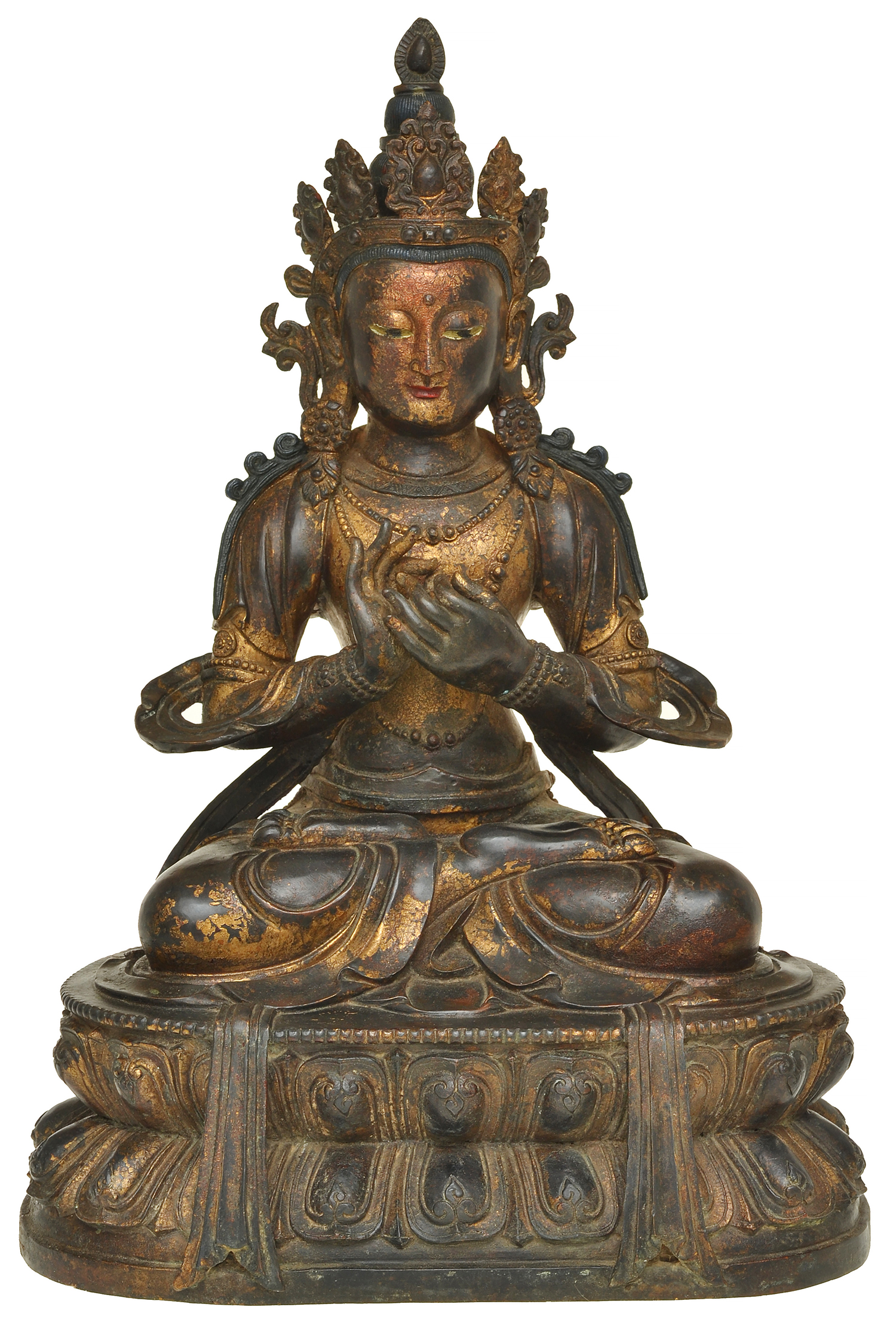modelled with a serene downcast gaze, seated on a double lotus base, hands in the dharmachakra mudra, 49 cm high