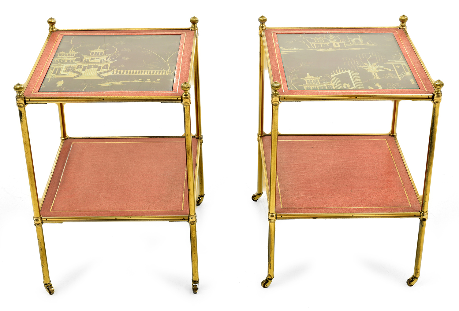 A GOOD QUALITY PAIR OF CHINOISERIE STYLE BRASS FRAMED LAMP TABLES