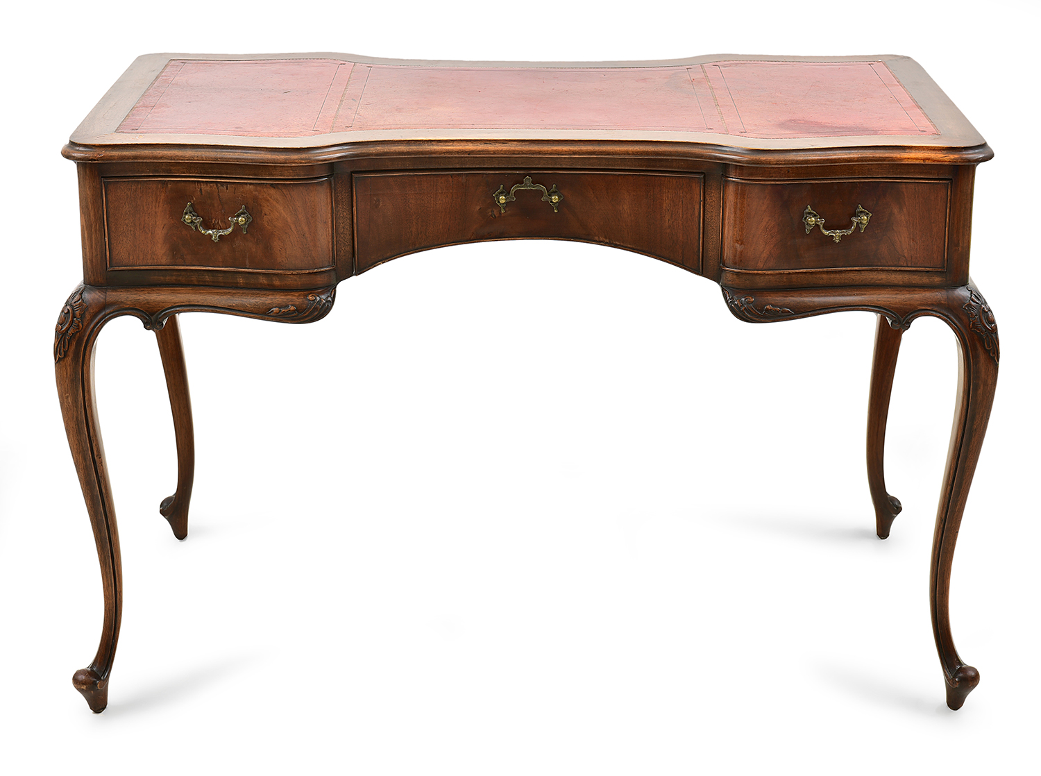 with a shaped rectangular leather inset top, above a single frieze drawer, cabriole legs, 77 x 113 x 59cm