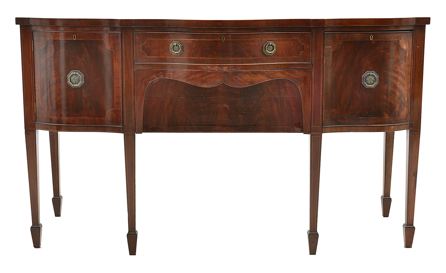 with a shaped rectangular top, above a central frieze drawer and a lower pot drawer, flanked by panelled doors, square tapering supports, 90 x 152 x 60cm