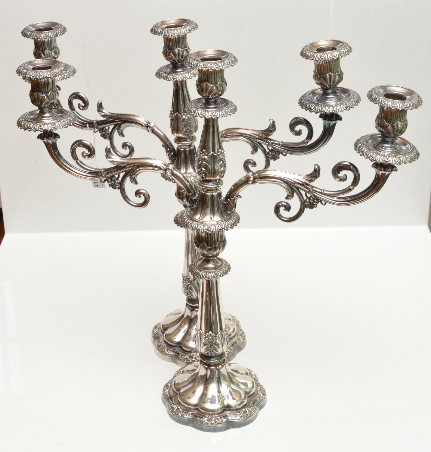 each with a central lobed acanthus leaf stem emanating two scroll work arms, supported by a lobed circular foot, 47cm high