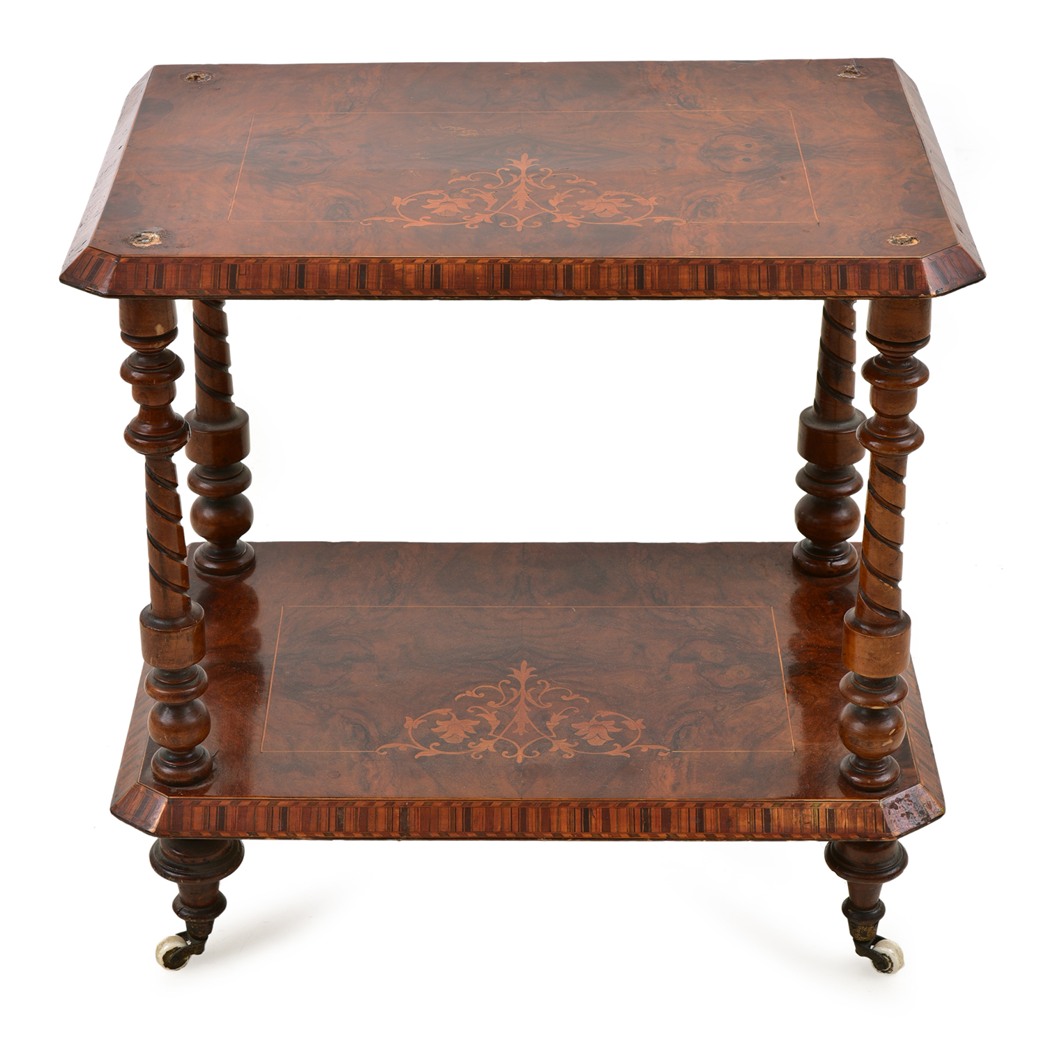 A VICTORIAN BURR WALNUT VENEERED AND MARQUETRY INLAID TWO TIER WHAT-NOT