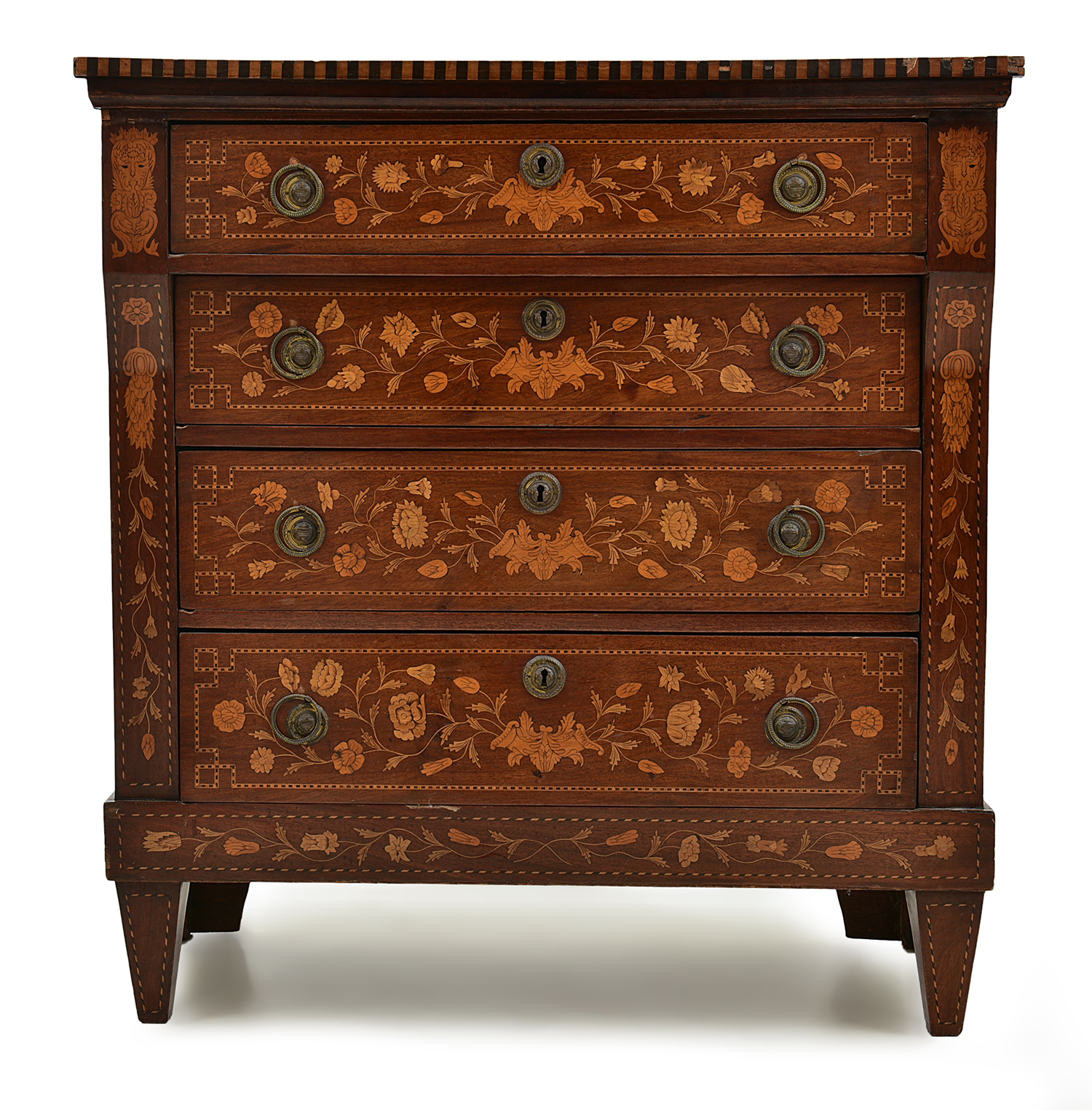 A 19TH CENTURY DUTCH WALNUT AND MARQUETRY FOUR DRAWER COMMODE