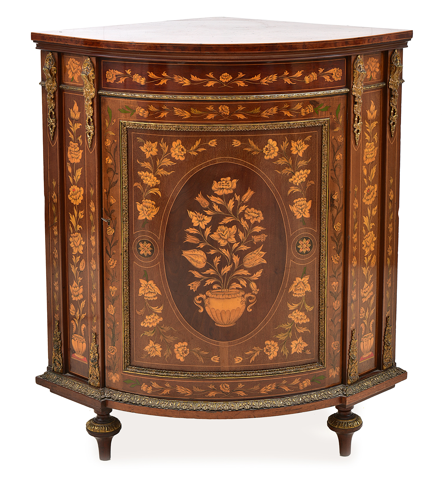 A DUTCH STYLE MARQUETRY INLAID CORNER CABINET