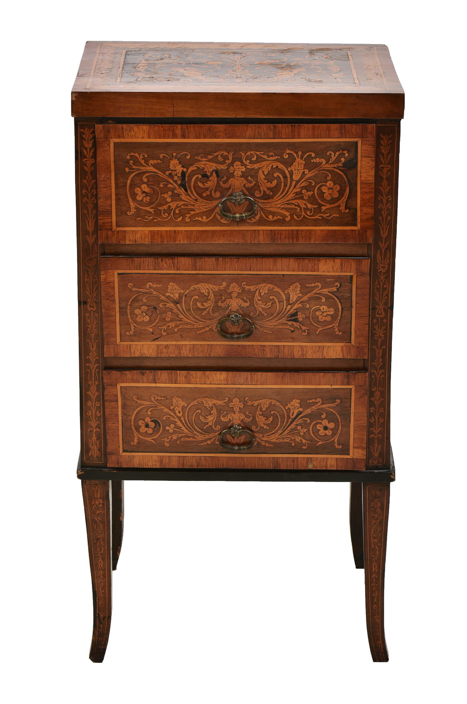 A 19TH CENTURY DUTCH WALNUT AND MARQUETRY THREE DRAWER COMMODE