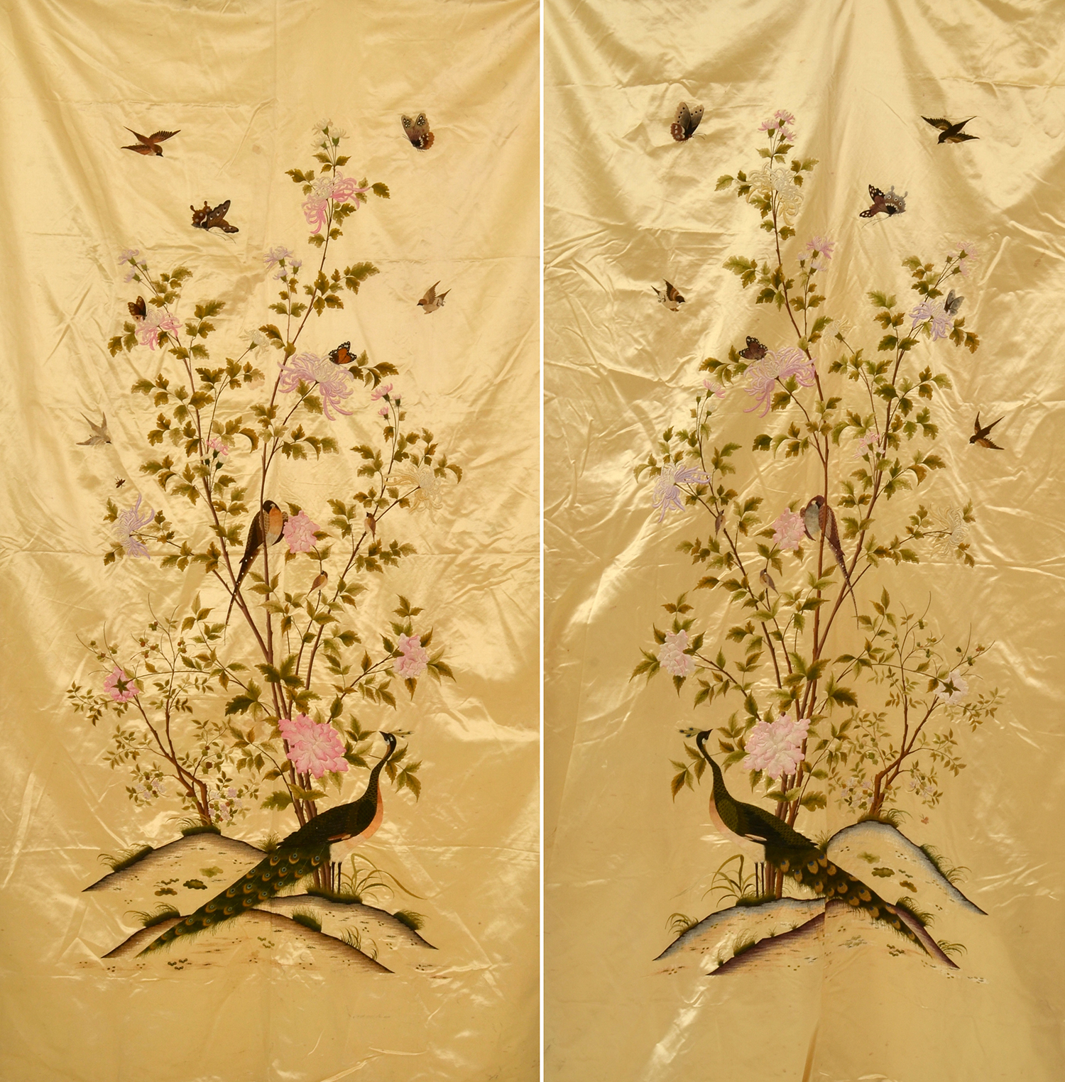 each hand embriodered with a scene of a peacock beneath a trailing garland of chrysanthemums