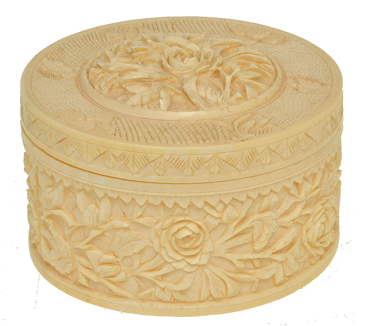 heavily carved with repeating rose motif to body, the lid with a cross-hatched border and a central rose cartouche, 5.5cm high, 10cm wide