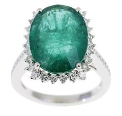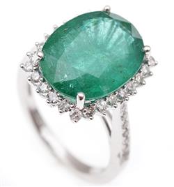 Comprising an emerald of 8.43cts, surrounded by round brilliant cut diamonds totalling 0.76cts, mounted in 18ct gold, ring size N.