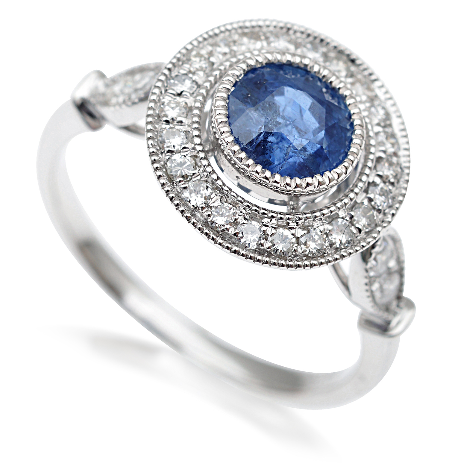 Centrally set with a round brilliant cut diamond of 0.50cts, surrounded by sapphires and round brilliant cut diamonds totalling 0.65cts, mounted in 18ct gold, ring size N.