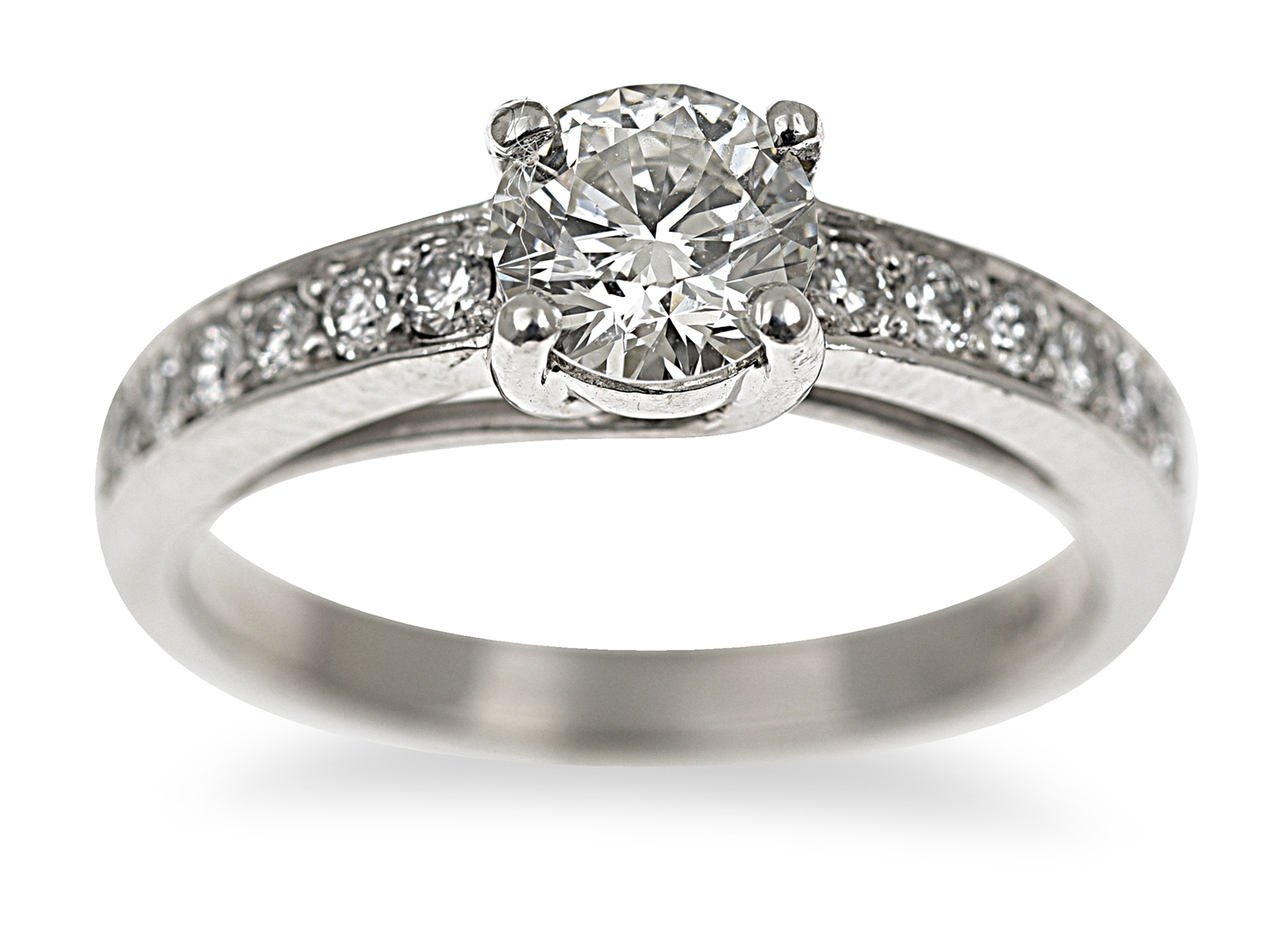 Centrally set with a round brilliant cut diamond of 0.90cts, with diamond set shoulders totalling 0.38cts, mounted in 18ct gold, ring size M-N.