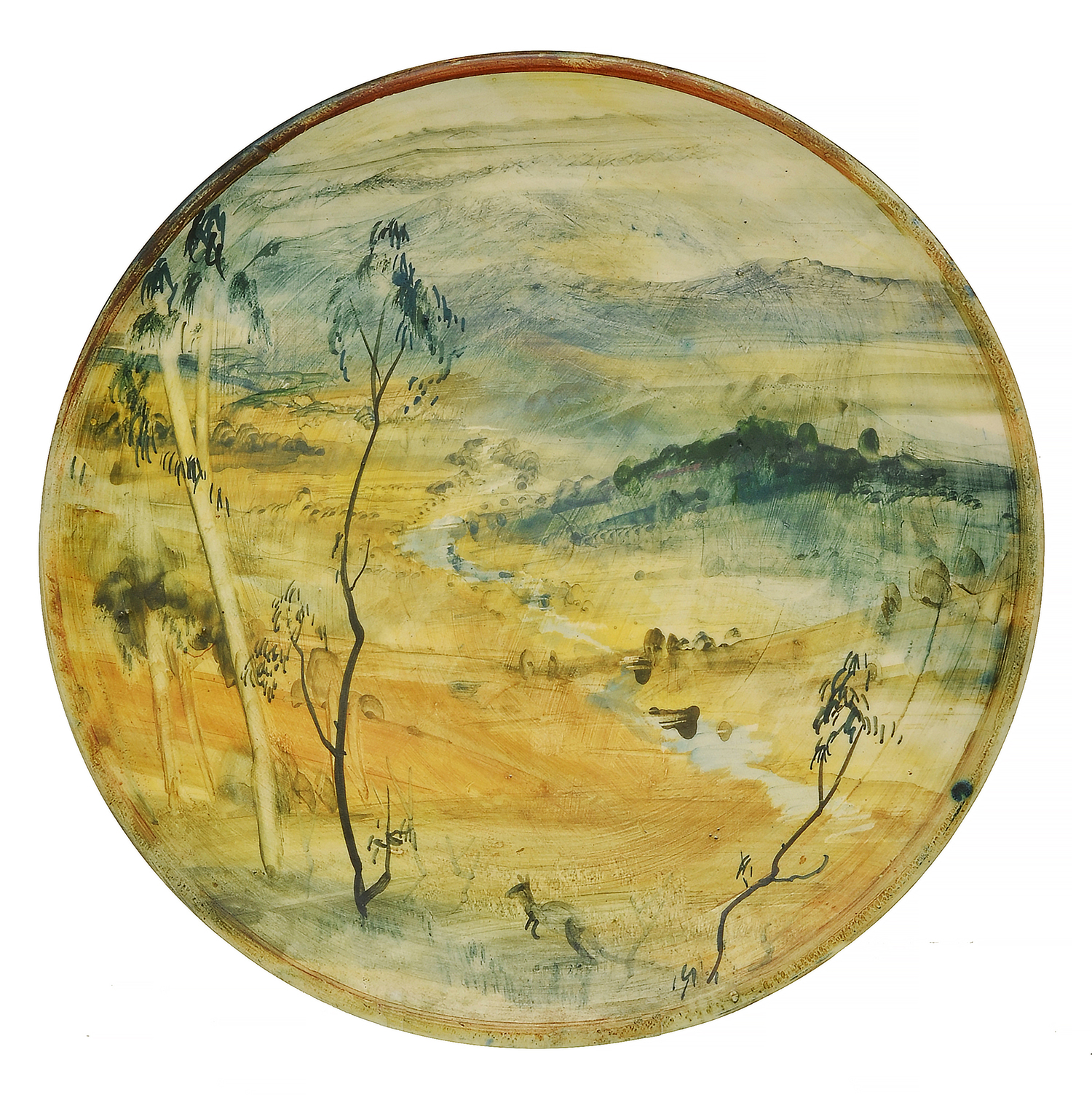 hand painted with a native Australian landscape scene of a river with a kangaroo in the foreground, signed Boyd, Murrumbeena and Neil Douglas to verso, 31cm diameter