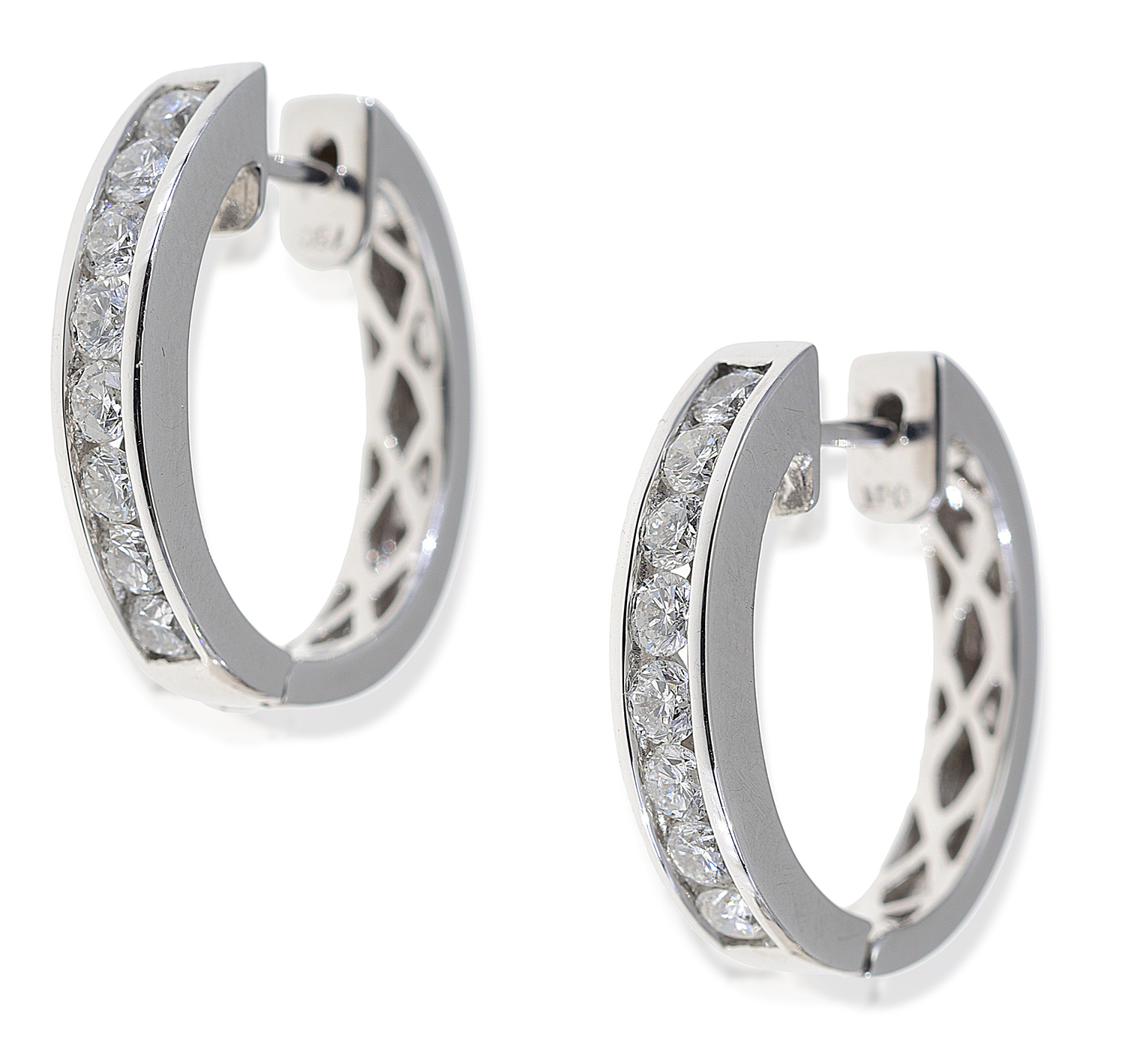 Each channel set with round brilliant cut diamonds totalling 0.55cts, mounted in 18ct white gold.
