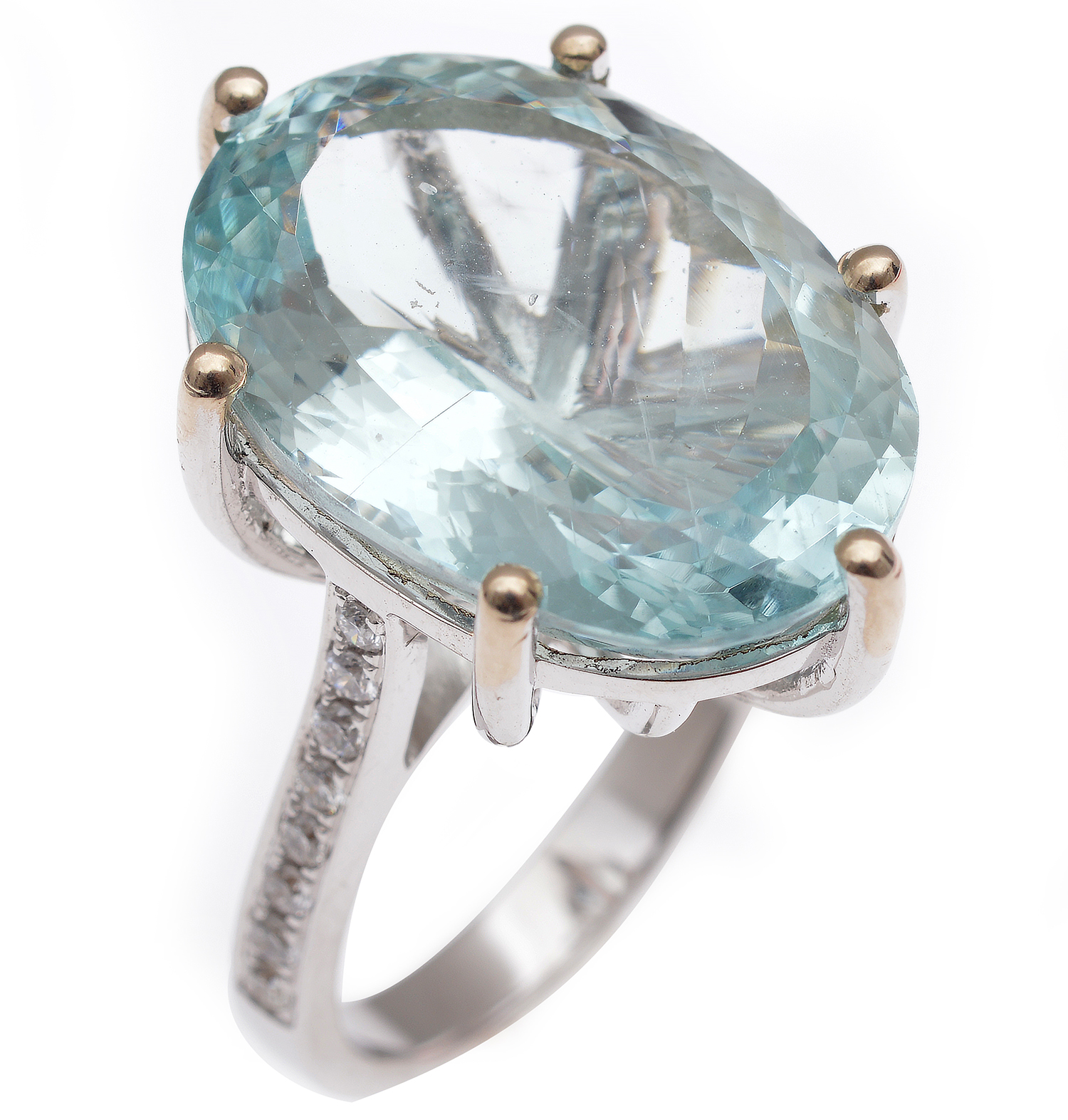 The oval cut aquamarine of 15.85cts in a six claw setting, with diamond set shoulders, mounted in 18ct white gold, ring size N.