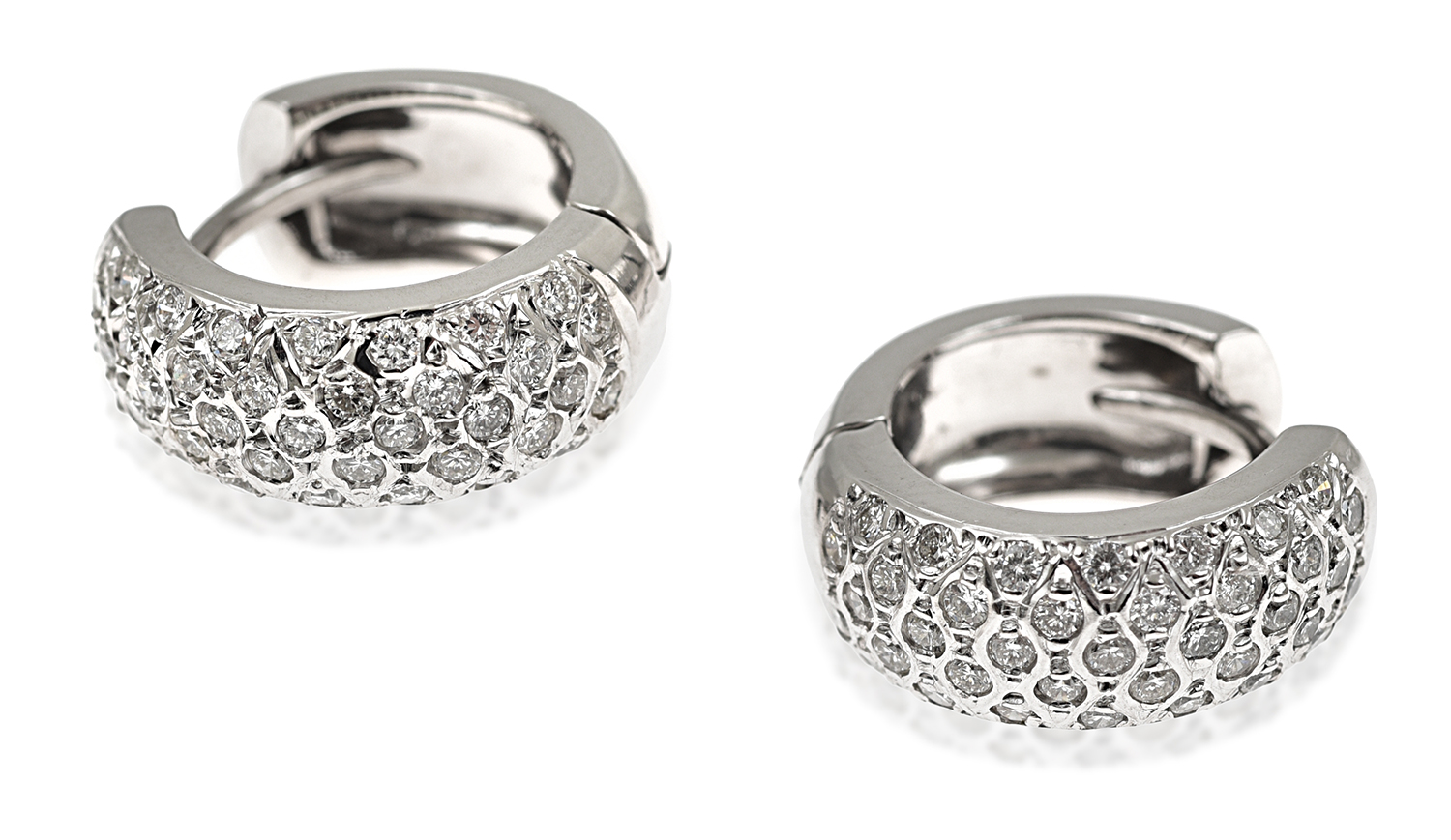 Each pave set with round brilliant cut diamonds totalling 0.55cts, mounted in 18ct white gold.