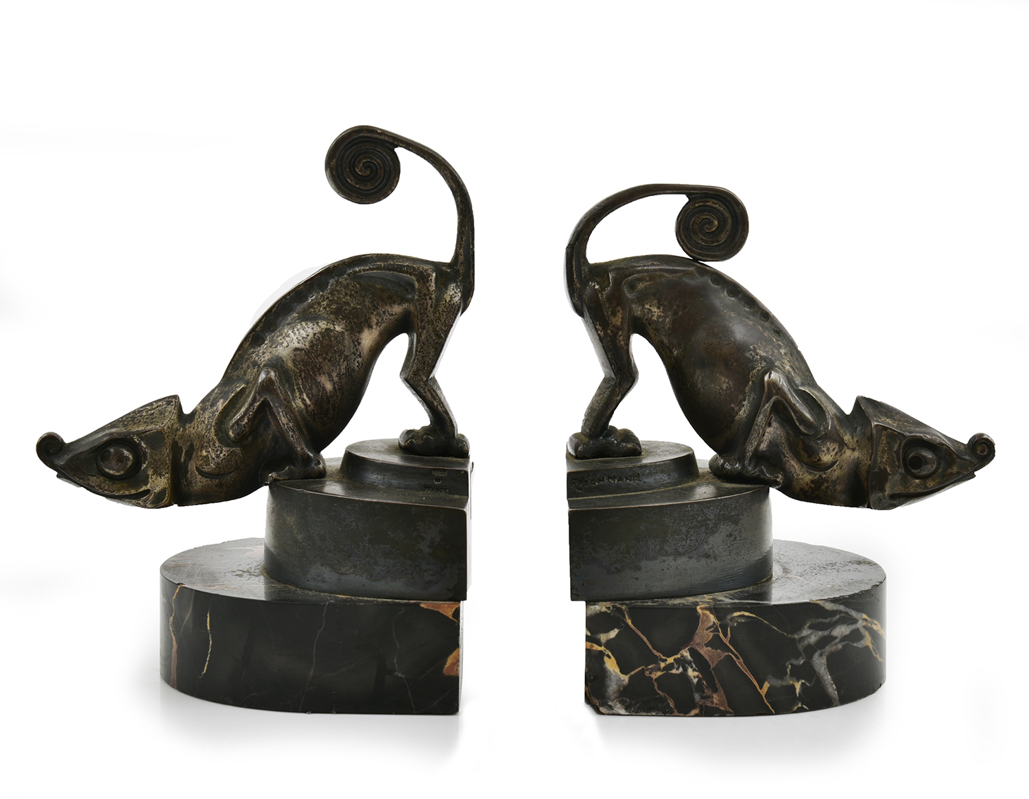 modelled with their body in extension, on an integral stepped base, with a marble base, stamped Rischmann, made in France to bronze base, 16cm total height