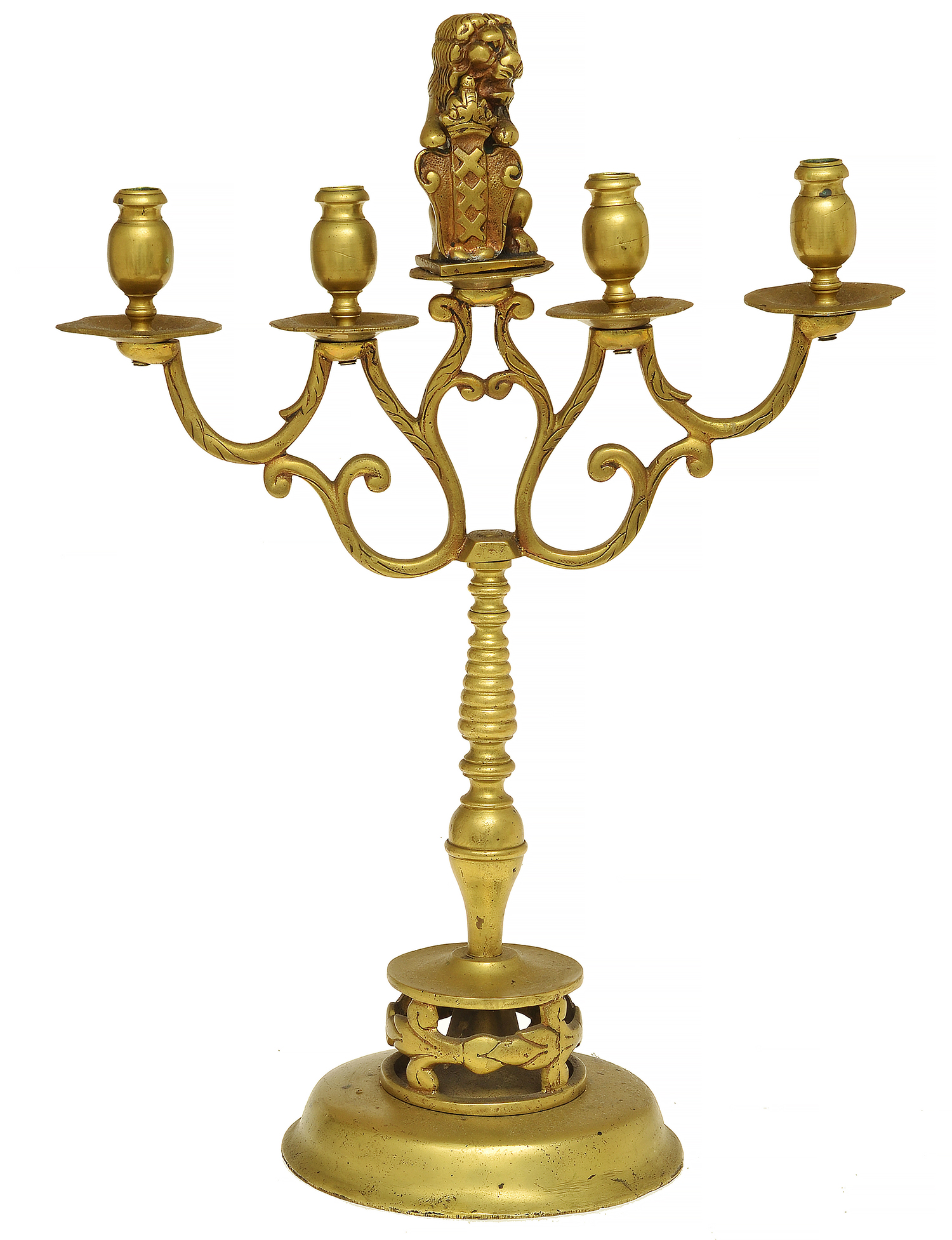each standard emanating four sconces with a central lion and crest finial, 55cm high