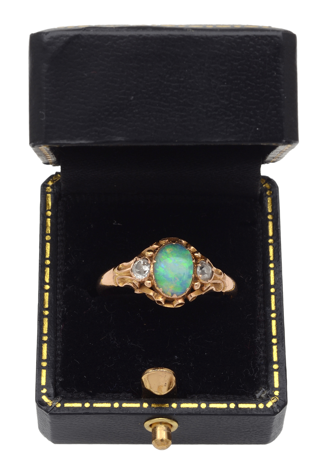 The oval solid white opal cut en cabochon, flanked by two old rose cut diamonds, mounted in 15ct gold, hallmarked, ring size S.