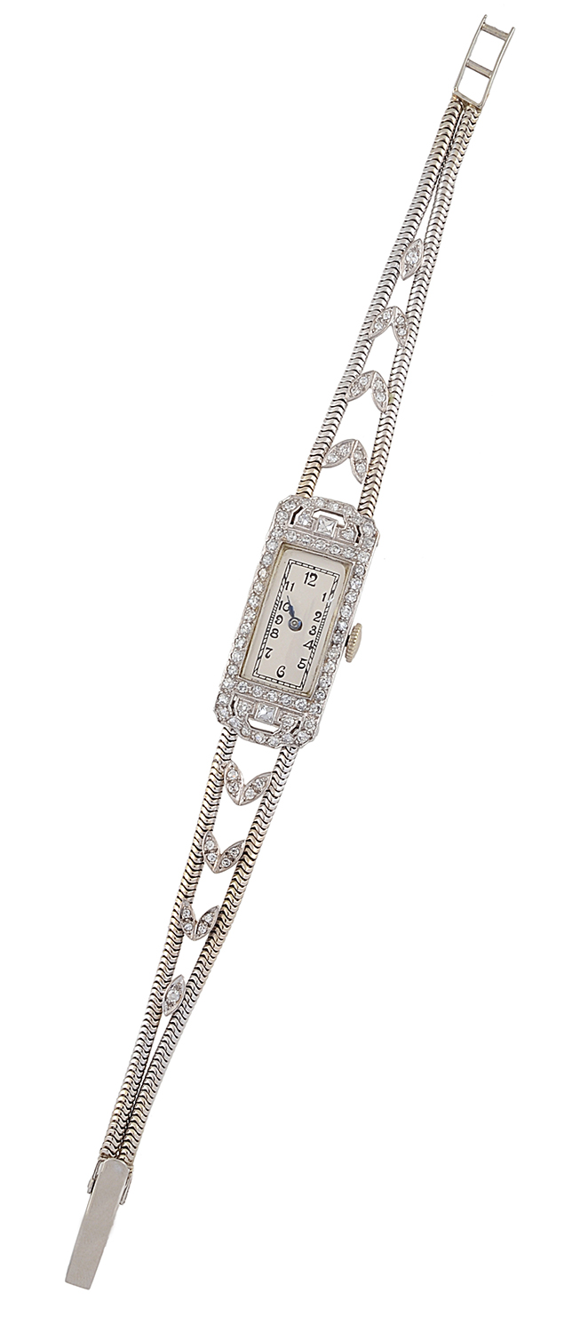Manual wind movement, silvered dial with black Arabic numerals, 18ct white gold and plated case set with single cut diamonds, to 18ct white gold snake link bands set with further diamond detail, total length 165mm, case length 30mm.
