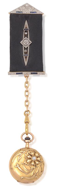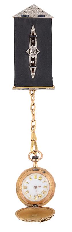Crown wind and set movement, white dial with gold Roman numerals, 18ct gold case with stylised floral scroll work set with an old European cut diamond, 22mm diameter, suspended from a swivel clip and belcher link chain to a black ribbon set with three geometric panels highlighted with rose cut diamonds and carre cut sapphires mounted in 18ct gold.
