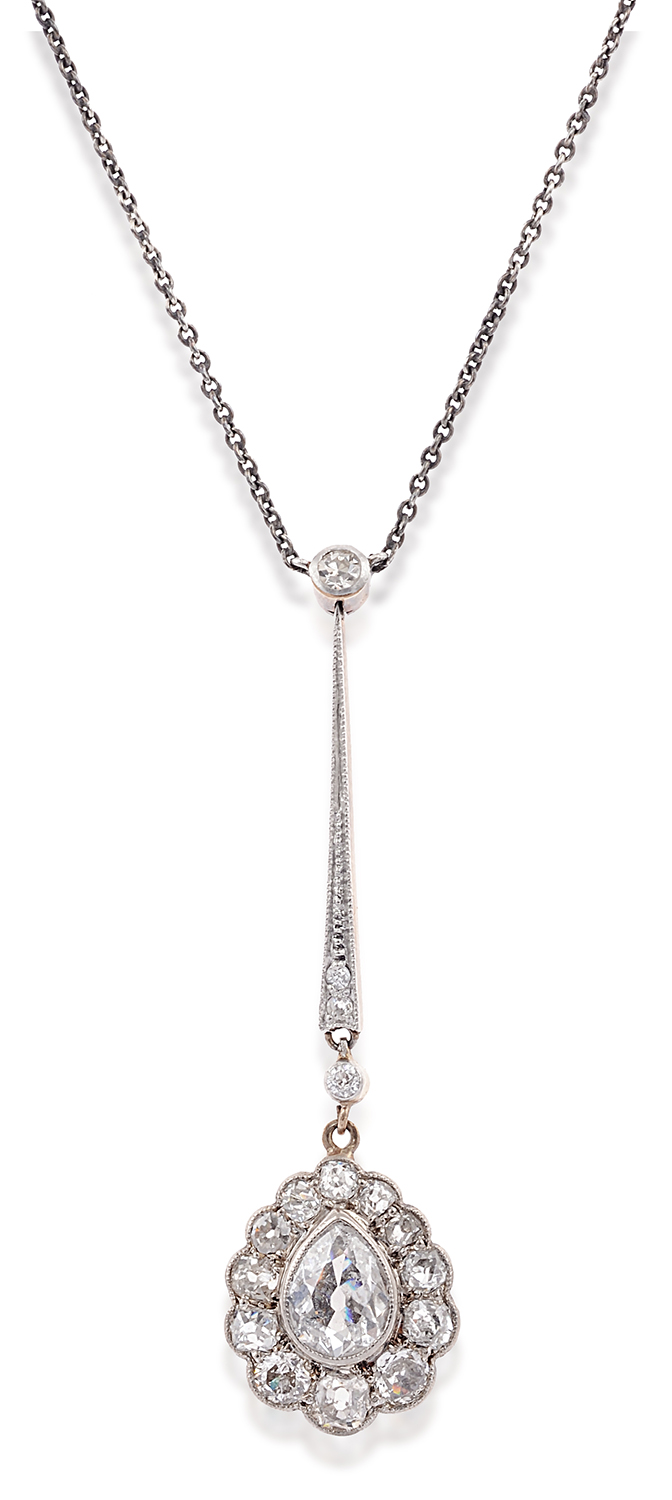 Featuring a pear cut diamond of 0.55cts surrounded by twelve graduated old European cut diamonds, suspended from a knife edge bar with further diamond detail and finished with a fine trace chain, all mounted in platinum and 18ct gold, total length 410mm.