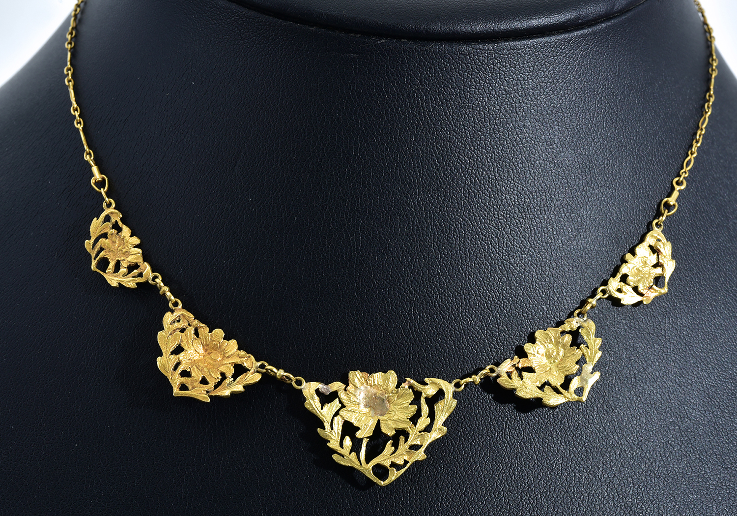 Necklace presents in excellent condition. Acid tested as 18ct gold. French eagle mark and signature are found near the clasp on a jump ring. Possible minor repair to reverse of one flower.