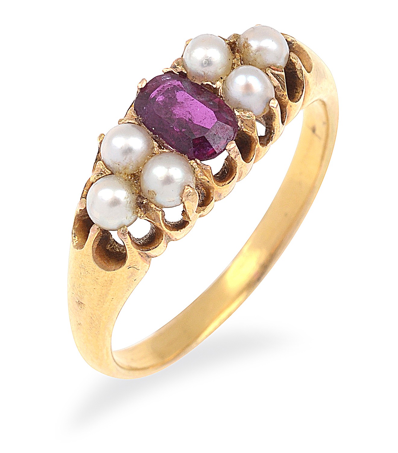 Centrally set with an oval cut ruby of 0.47cts and flanked by a trefoil of seed pearls, mounted in 15ct gold, ring size Q.