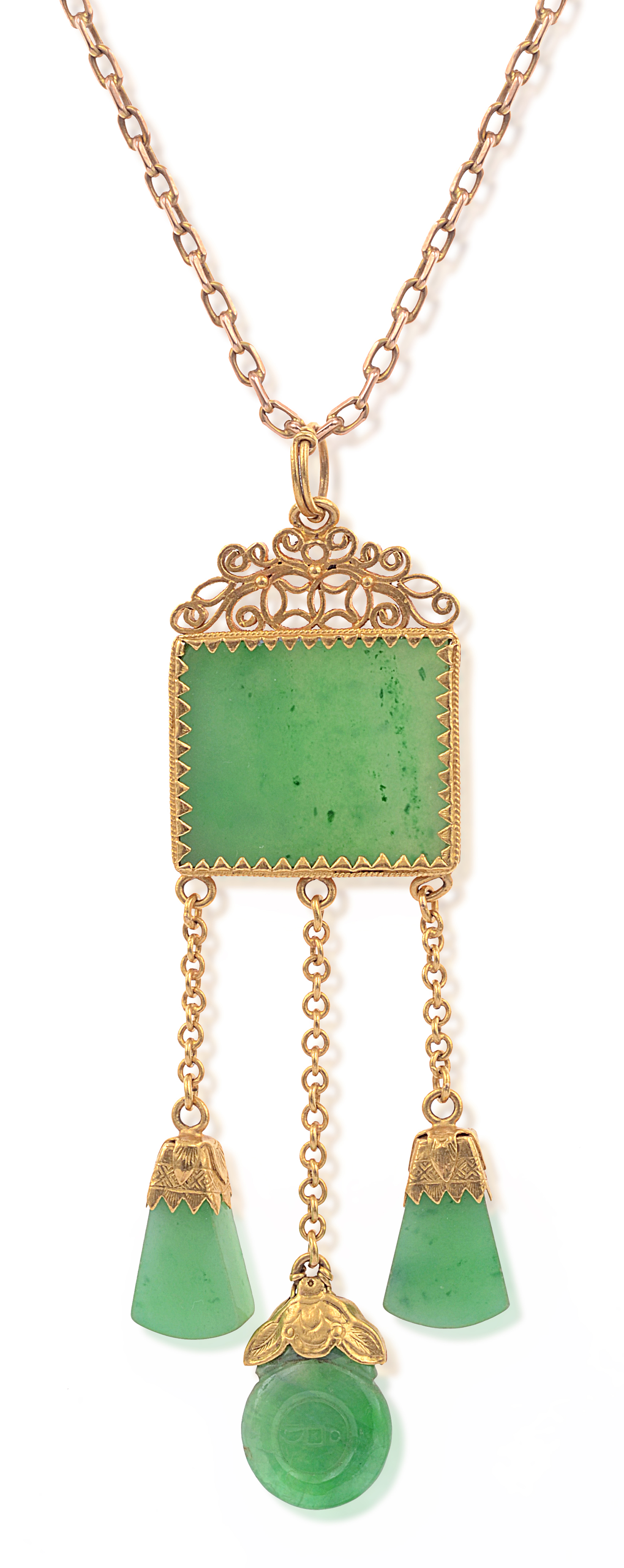 The Chinese pendant featuring a rectangular polished panel of green jadeite, with three conforming polished and carved drops, mounted in 22ct gold, with pierced and chased frames, suspended from a belcher link chain in 14ct gold, total length 490mm.