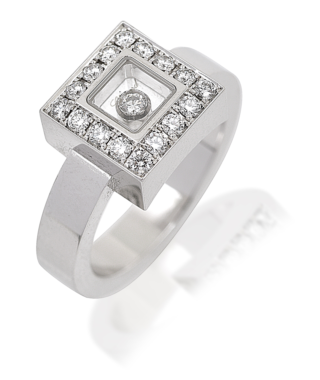 The square panel having a central floating round brilliant cut diamond amongst a border of further diamonds, mounted in 18ct white gold, signed, ring size M.