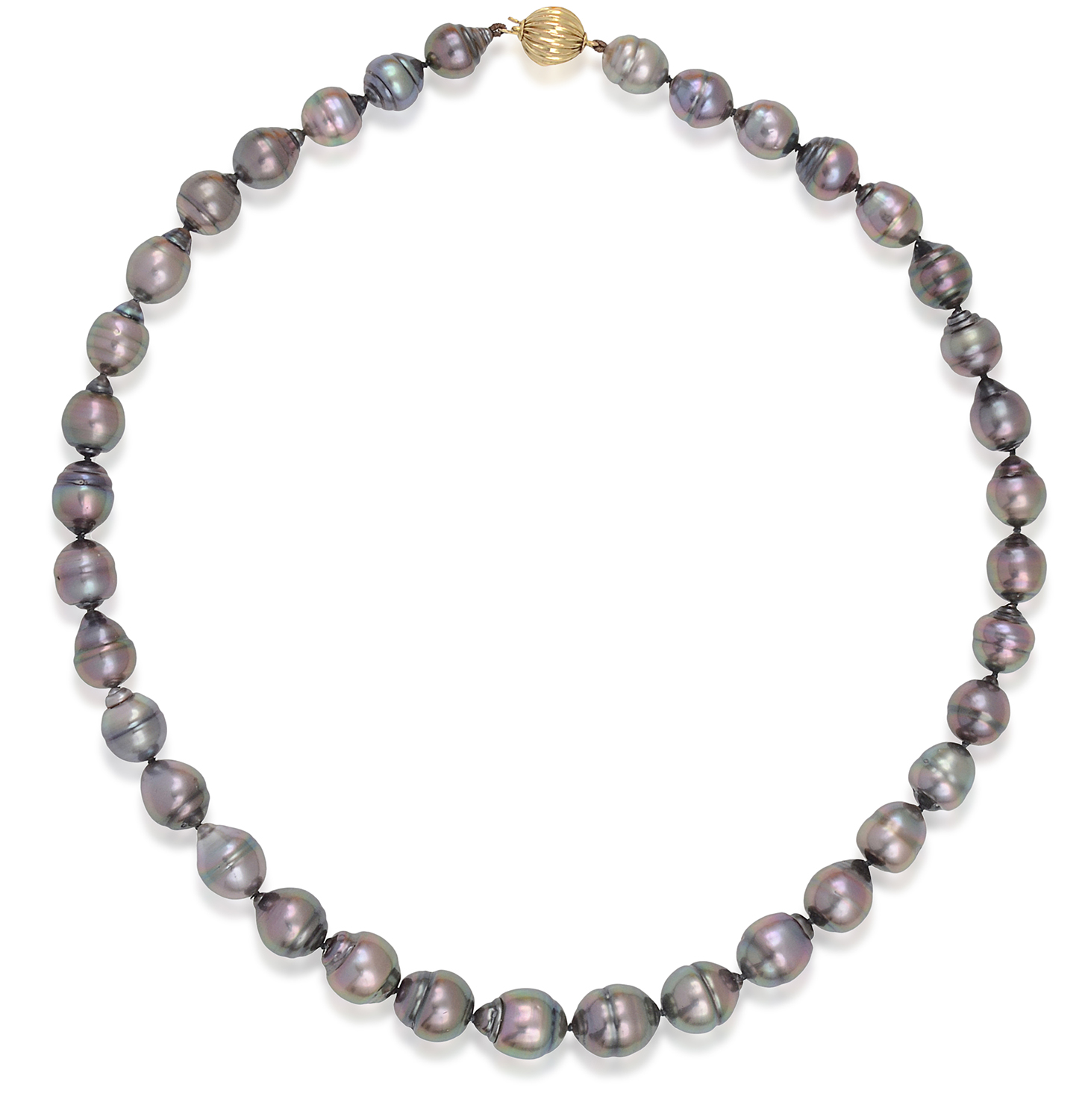 The thirty six baroque pearls of aubergine and pink hues measuring 9.7mm to 11.8mm to a gold fluted ball clasp, total length 470mm.