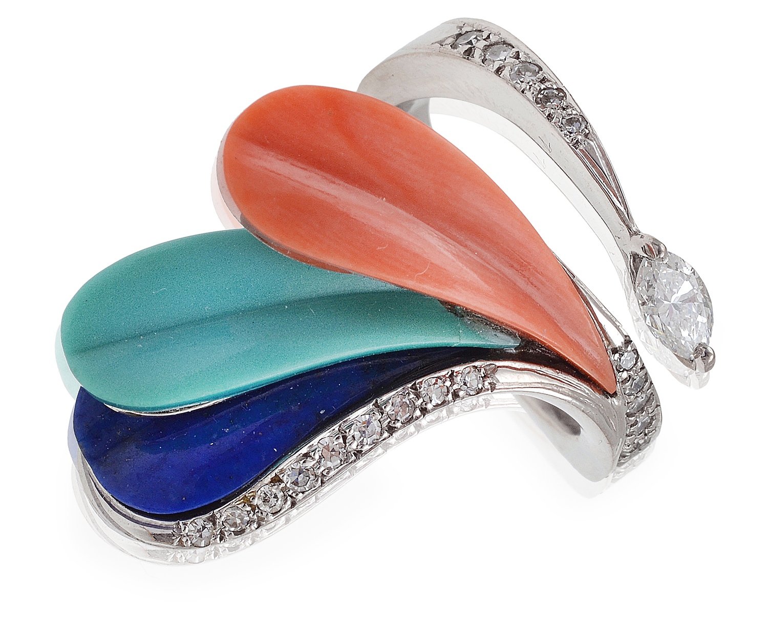 The stylised design having a marquise cut diamond offset by three fluted tear drop panels of coral, turquoise and lapis lazuli with further diamond detail throughout, mounted in 18ct white gold, signed, ring size K.