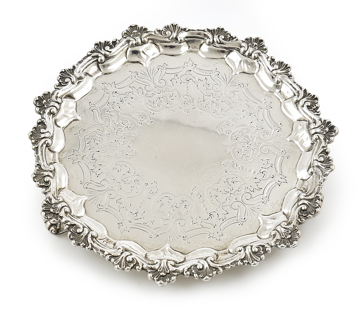 circular, with a moulded shell and scroll border, on three shell and scroll feet, the centre engraved with a repeating scroll design, approximately 348 gms, 21cm diameter
