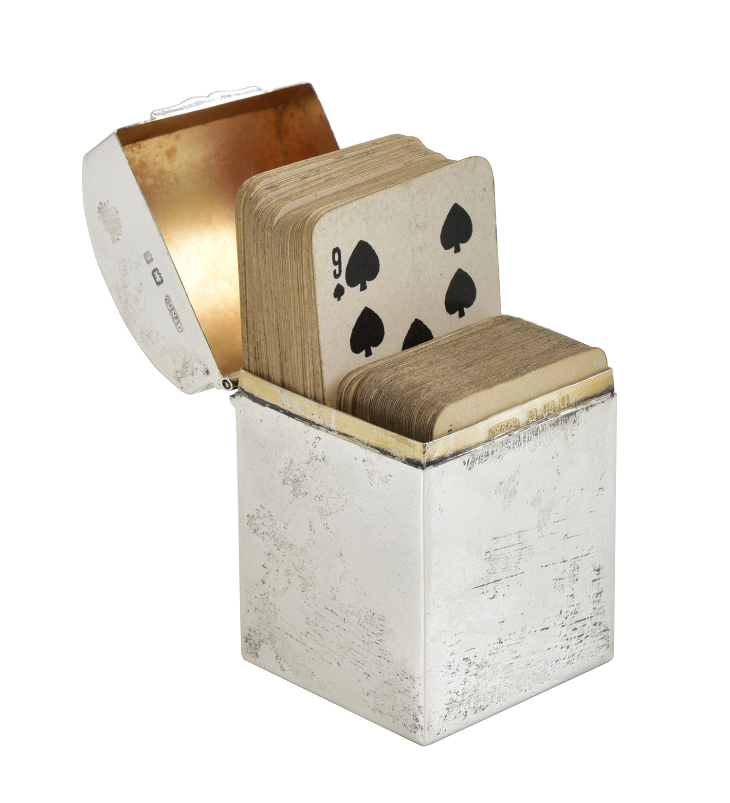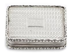 the card set housed in a domed silver case, maker's marks for Grey & co., Birmingham, 1905, 5.5cm high; the vinaigrette with a raised border and an engraved outer case, maker's marks for Thomas Shaw, Birmingham, 1837